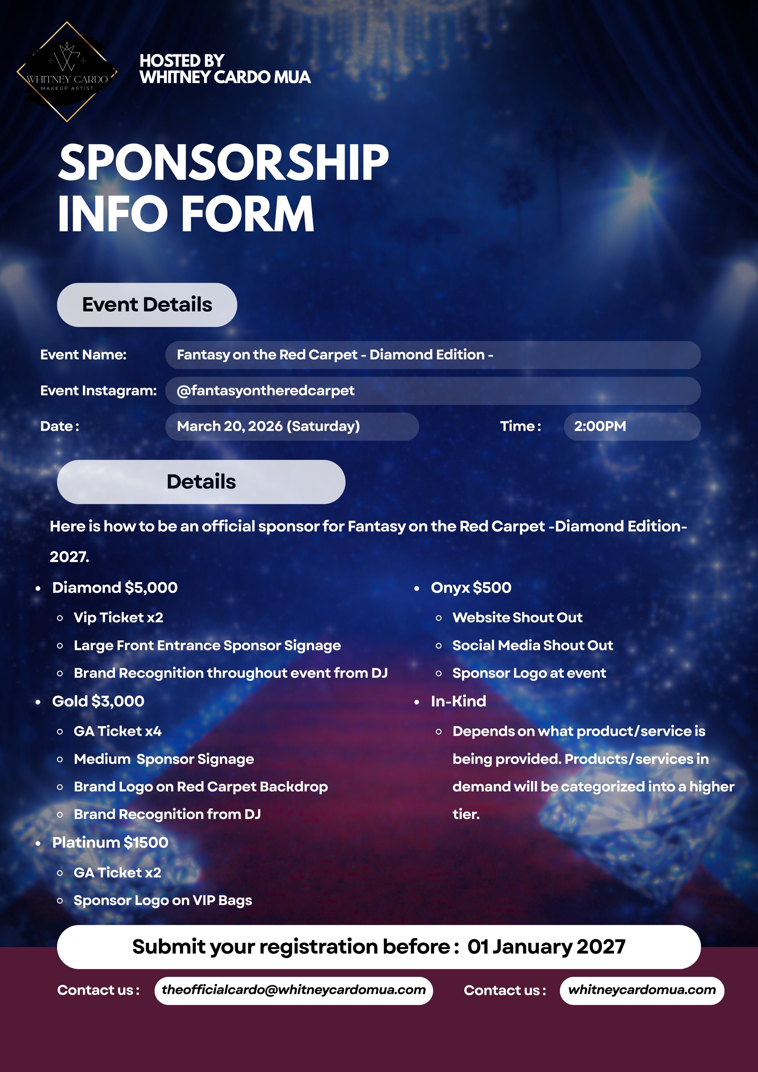 At Fantasy on the Red Carpet – Diamond Edition, sponsors are woven into the experience—featured across red carpet backdrops, VIP spaces, and unforgettable guest moments. Every detail is designed to create lasting impressions and meaningful connections.